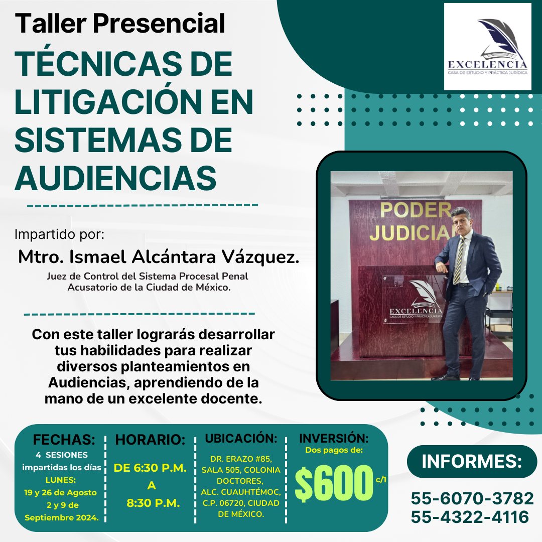 - Experiencia en Audiencias: El Mtro. Ismael Alcántara Vázquez, con vasta experiencia en el Sistema Procesal Penal Acusatorio, será tu guía en este taller.