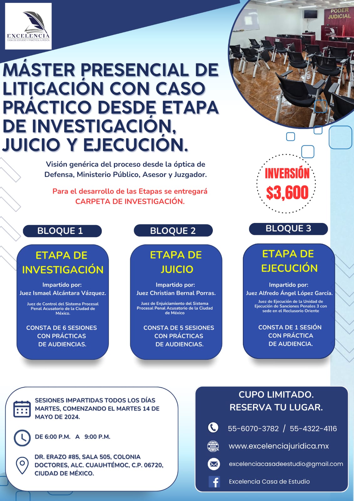 ¿Estás buscando un curso que te brinde una visión integral y práctica del proceso judicial? La “Excelencia Casa de Estudio y Capacitación Jurídica” te invita a participar en su nuevo Máster Presencial de Litigación, un programa único que abarca desde la etapa de investigación hasta la ejecución de sentencias. Este curso está diseñado para ofrecerte una experiencia completa y práctica, impartida por jueces expertos en cada área.